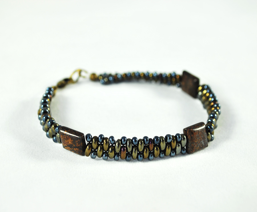 Elegant masculinity defines this stunning men’s bracelet. Its bronzite beads are beautifully cut to complement any man’s wardrobe. Woven two-hole glass beads create a leather-like effect that exudes machismo.
